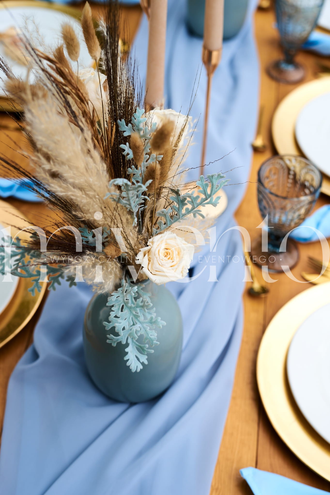 - bieżnik różowy oraz serwety materiałowe w kolorze niebieskim